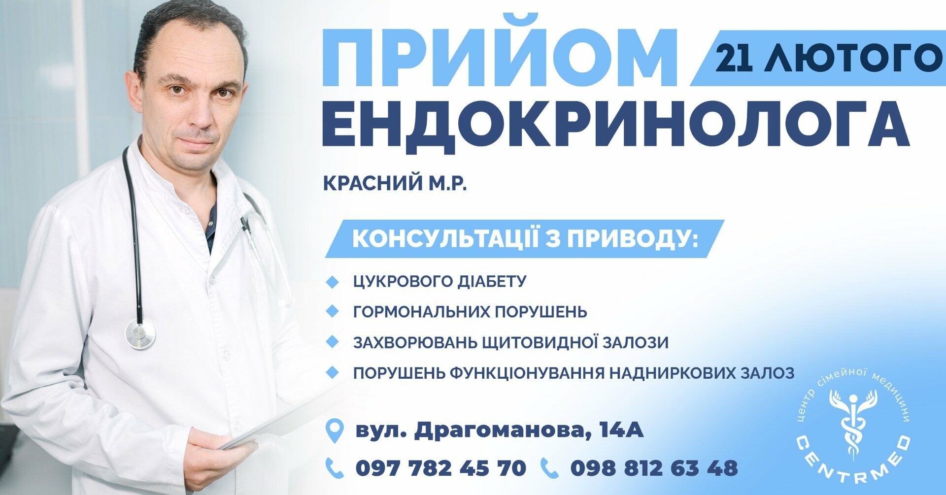 У ЦСМ веде прийом Красний М. Р. - лікар-ендокринолог Львівського ендокринологічного центру.